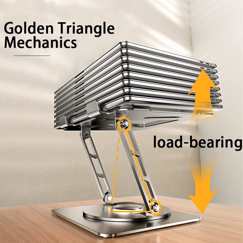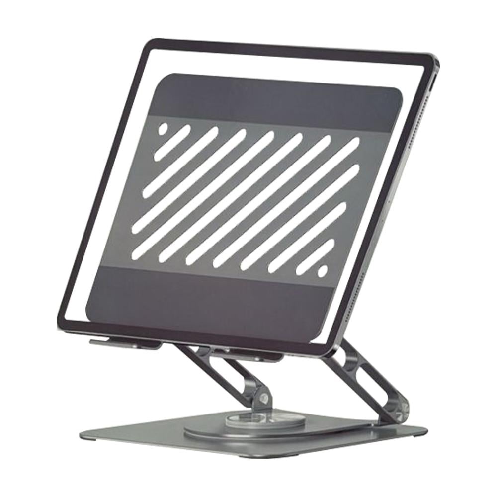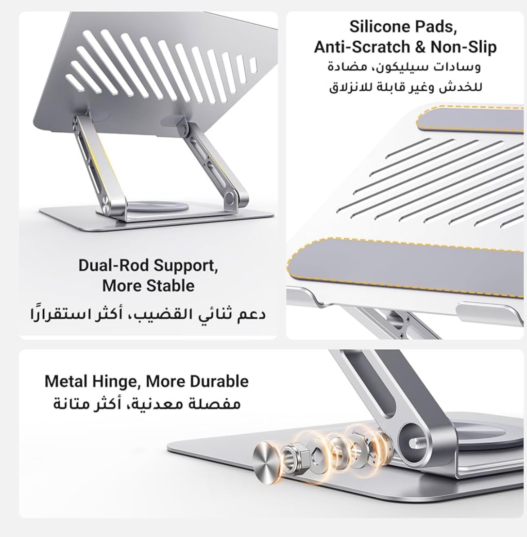 حامل لابتوب وتابلت مكتبي قابل للطي والدوران 360°، يتميز بتصميم معدني متين مع سطح سيليكوني مقاوم للانزلاق والخدش، وفتحات تهوية لتبديد الحرارة. مثالي للعمل والدراسة ويوفر زاوية مشاهدة مريحة
