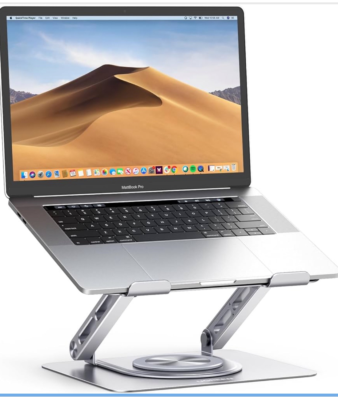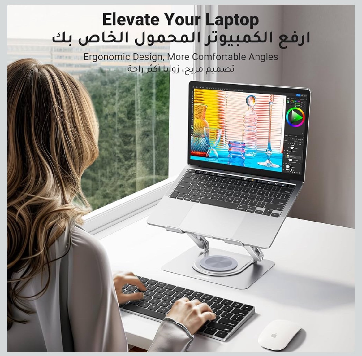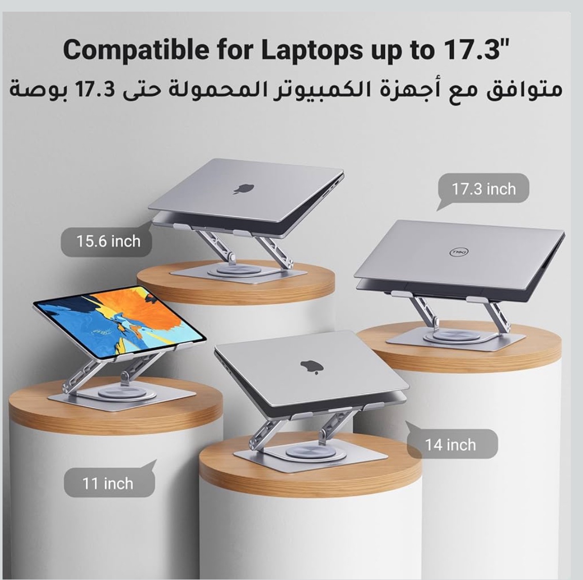 حامل لابتوب وتابلت مكتبي قابل للطي والدوران 360°، يتميز بتصميم معدني متين مع سطح سيليكوني مقاوم للانزلاق والخدش، وفتحات تهوية لتبديد الحرارة. مثالي للعمل والدراسة ويوفر زاوية مشاهدة مريحة